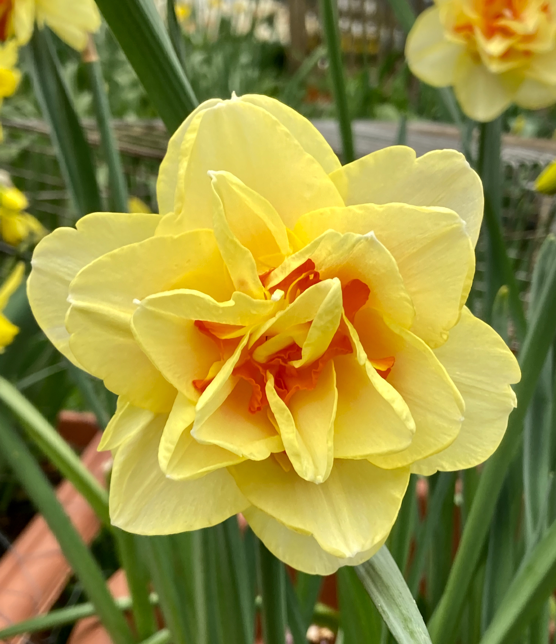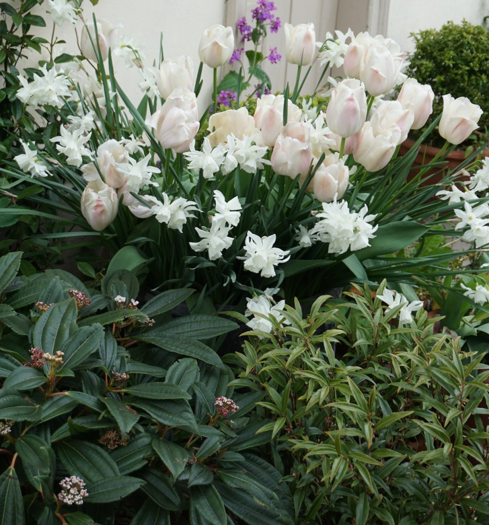 Daffodils are such cheerful flowers and vary in size and colour. Apart from the ubiquitous yellow, some are white, pale green and others have pinkish orange trumpets, so quite a lot to choose from. The smaller varieties such as ‘Tete-a-tete’ and ‘February Gold’ flower earlier than the bigger ones and look good grown in clumps some place where they can be easily seen from the window of a house. Daffodils can also be planted mixed with tulips of similar colour (See photo above) to give a variety of shapes.